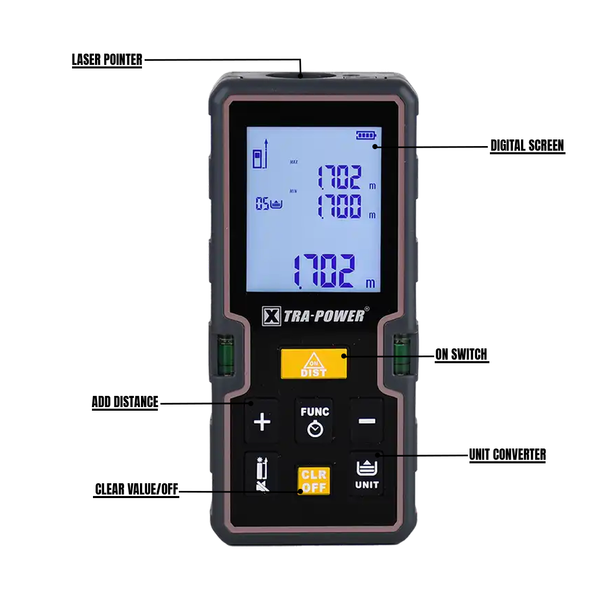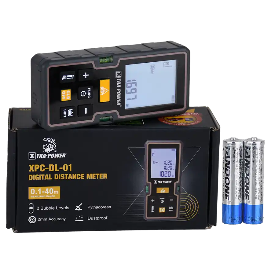 The XPC-DL-01 Digital Meter 40M by Xtra Power is a precision-engineered measuring tool designed for accuracy and durability in various applications. Featuring a compact mini display unit, it offers measurements in multiple units, including meters, inches, feet, and feet+inches, ensuring versatility for diverse tasks. The device is powered by 2x1.2V batteries and incorporates advanced features such as an auto laser switch-off after 30 seconds and an auto instrument switch-off after 3 minutes, enhancing battery efficiency. With a high accuracy of 2mm and dual bubble levels, it ensures precise measurements even in challenging environments. The inclusion of Pythagorean functionality allows for indirect measurements, making it ideal for complex layouts. Its dustproof construction ensures reliability in rugged conditions, while the ergonomic design promotes ease of use. Whether for construction, engineering, or detailed measurement tasks, the XPC-DL-02 combines innovation and practicality, making it a reliable choice for those seeking a high-performance digital meter.